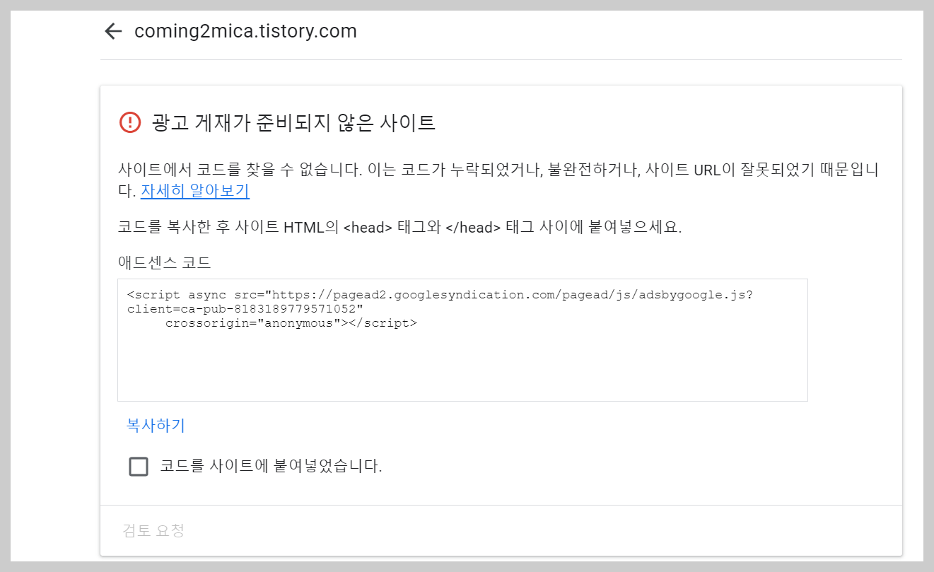 티스토리 html 복사 붙여넣기를 완료했다면, 광고게재가 준비되지 않은 사이트라고 안내받은 페이지로 다시 돌아가, 코드를 사이트에 붙여넣었습니다.