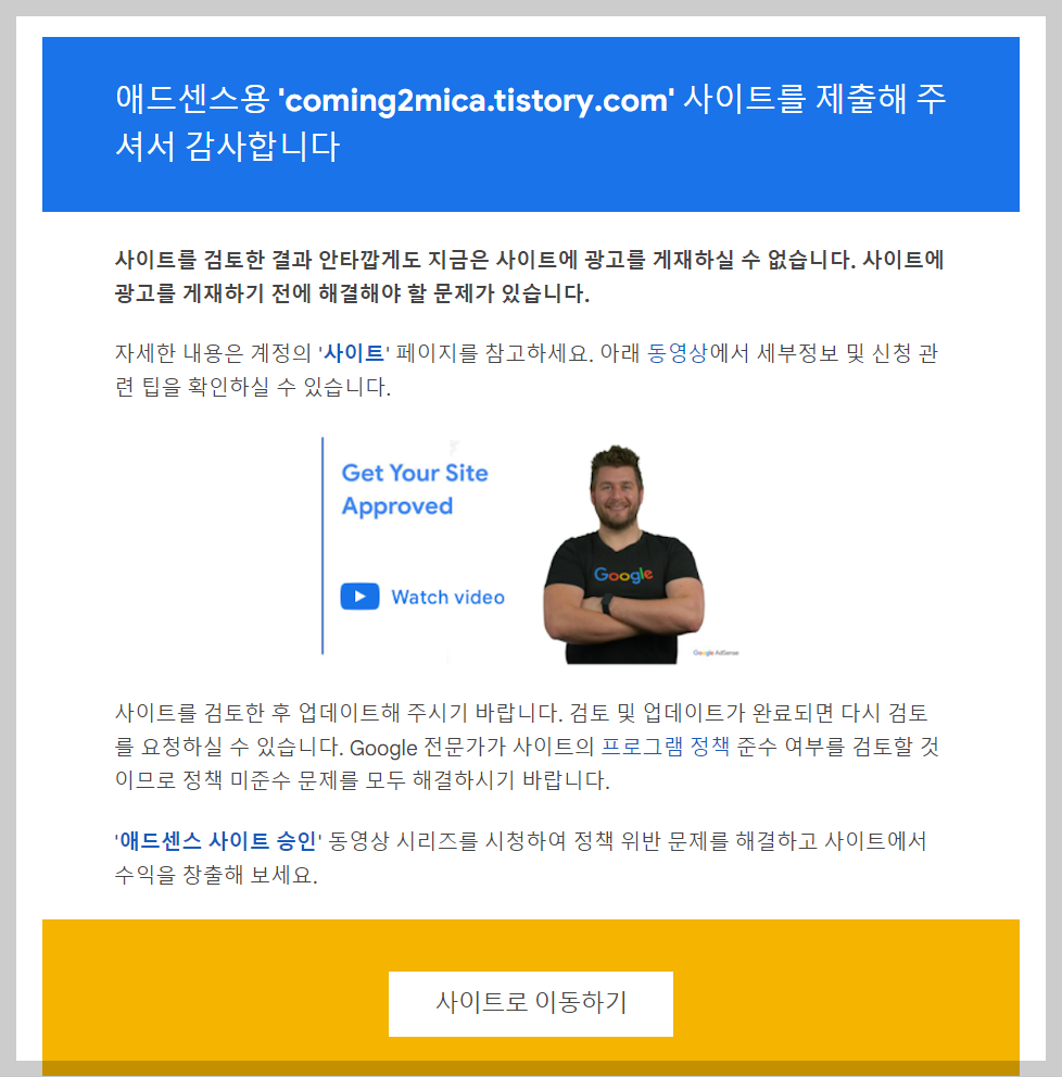 신청 후 얼마 지나지 않아, 구글메일이 한 통 왔는데요~ 광고 게재가 준비되지 않은 사이트라고 문구가 뜨더군요.
